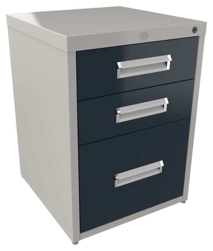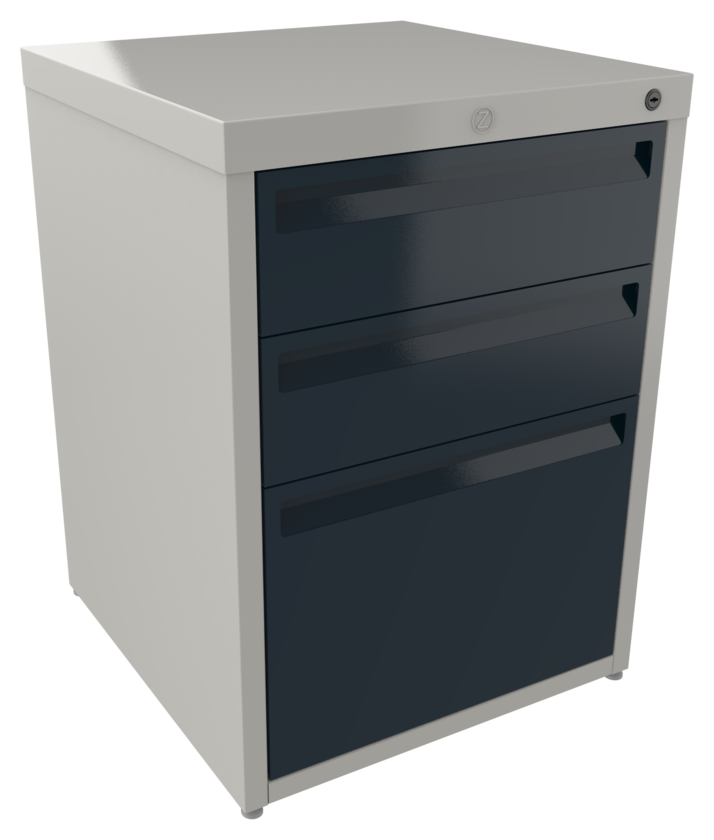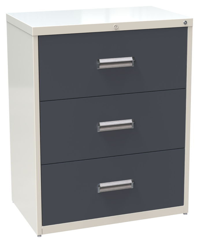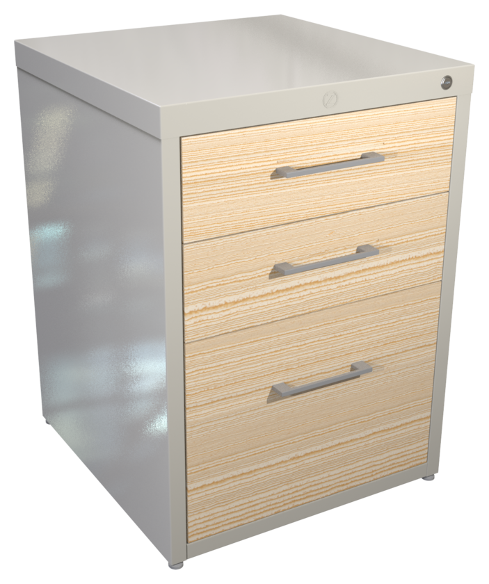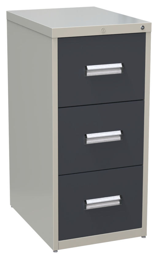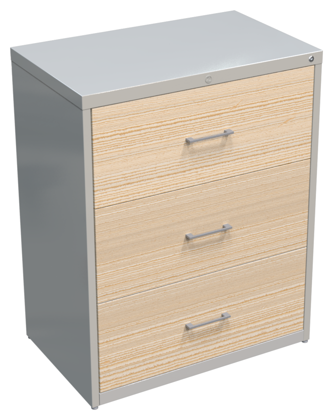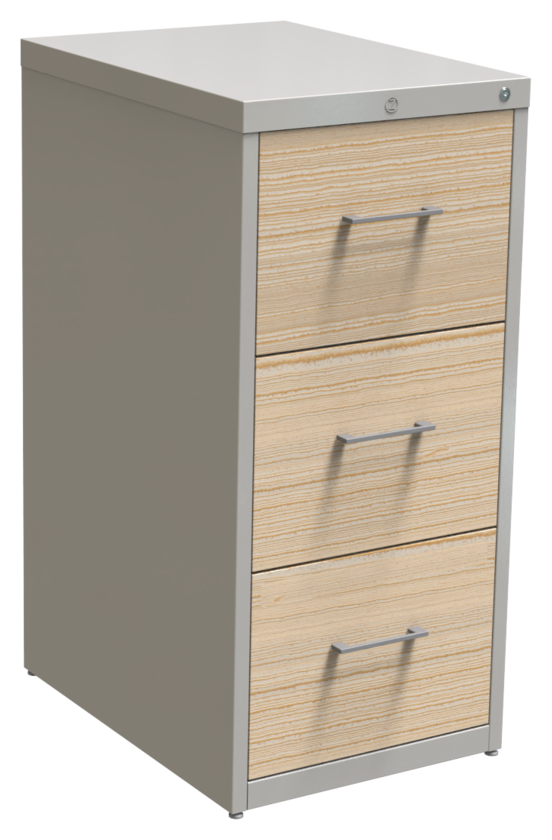 Archivero metálico vertical de 3 gavetas, 2 cajones papeleros y 1 cajón archivo tamaño oficio, cuerpo metálico con frentes en melamina, corredera de extensión móvil, nivelador de altura, jaladera y cerradura.