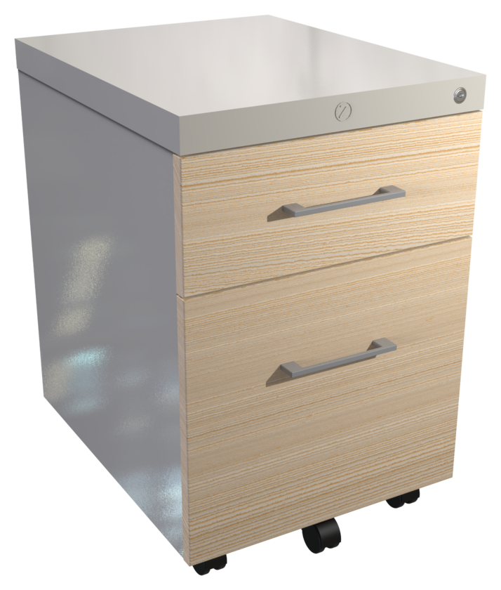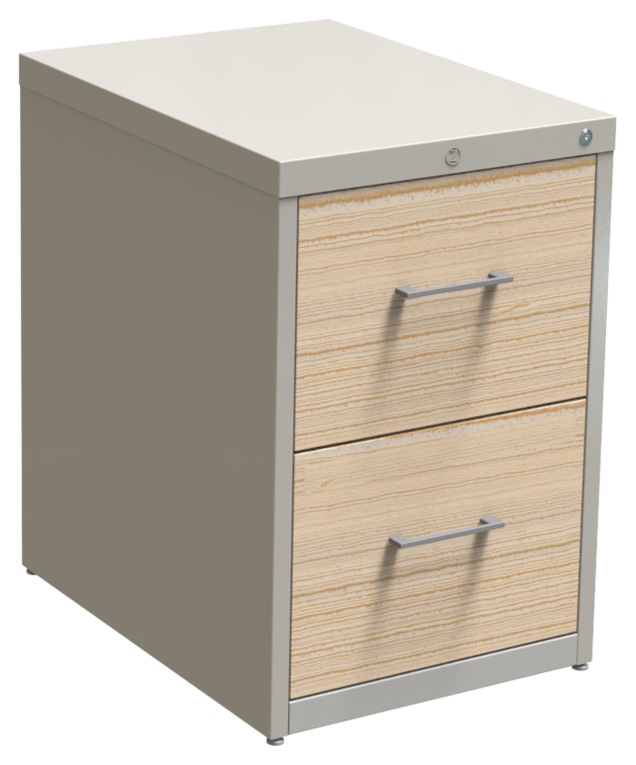 Archivero metálico vertical 1+1 cajón papelero y cajón de archivo tamaño carta, cuerpo metálico con frentes en melamina, corredera de extensión móvil, rodajas, jaladera , cerradura general y terminado en pintura electrostática.