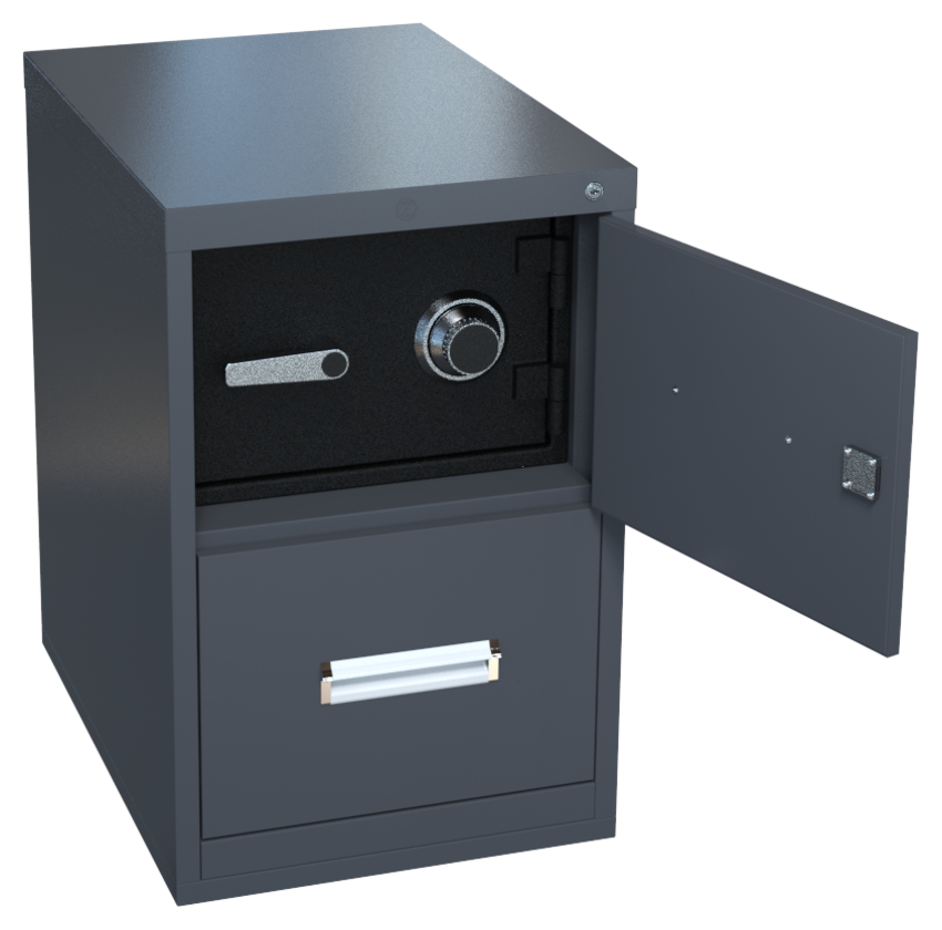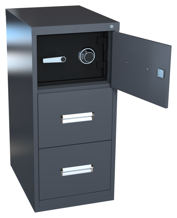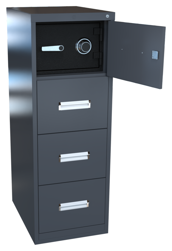 Archivero metálico vertical, gavetas tamaño oficio y caja fuerte con marco inferior de tubular y resbalón metálico, para soportar peso, corredera de extensión móvil, jaladera de aluminio, doble cerradura general y terminado en pintura electrostática.