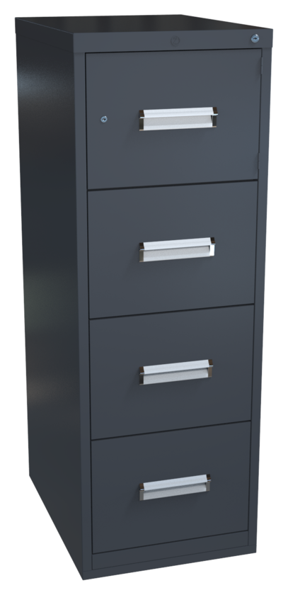 Archivero metálico vertical, gavetas tamaño oficio y carta, corredera de extensión móvil, nivelador de altura, jaladera embutida, cerradura general y terminado en pintura electrostática.