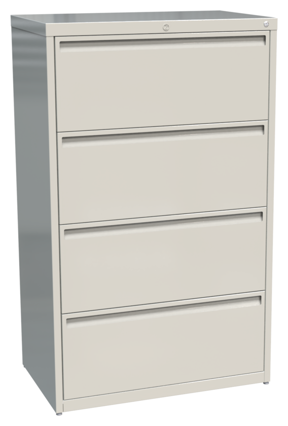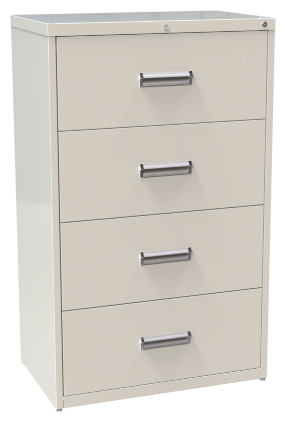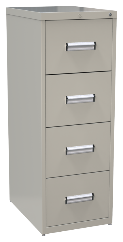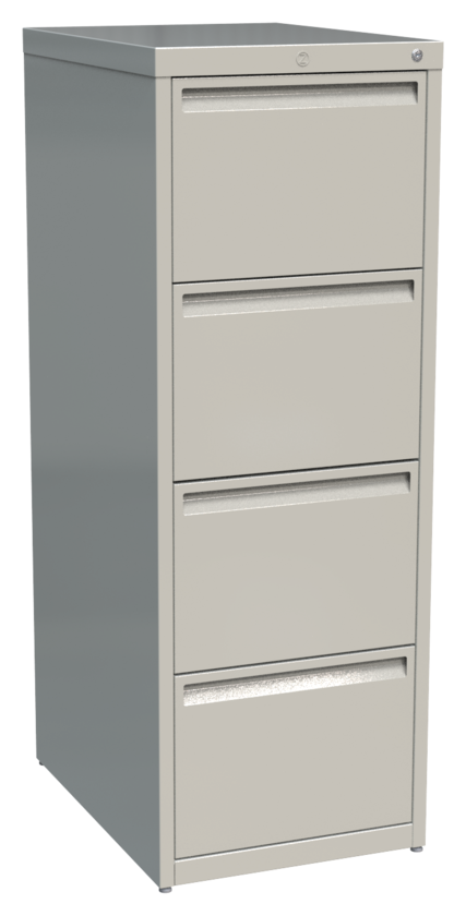 Archivero metálico vertical, gavetas tamaño oficio y carta, corredera de extensión móvil, nivelador de altura, jaladera embutida de aluminio, cerradura general y terminado en pintura electrostática.