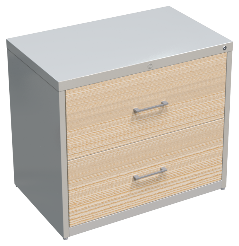 Archivero horizontal, gavetas tamaño oficio, cuerpo metálico con frentes en melamina, corredera de extensión móvil, nivelador de altura, jaladera satinada, cerradura general y terminado en pintura electrostática