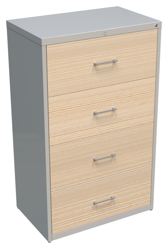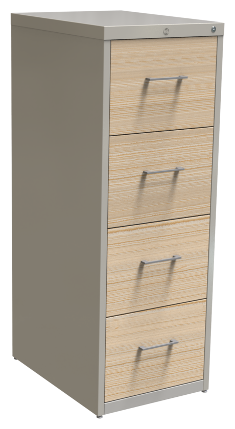 Archivero vertical, gavetas tamaño oficio, cuerpo metálico con frentes en melamina, corredera de extensión móvil, nivelador de altura, jaladera satinada, cerradura general y terminado en pintura electrostática.