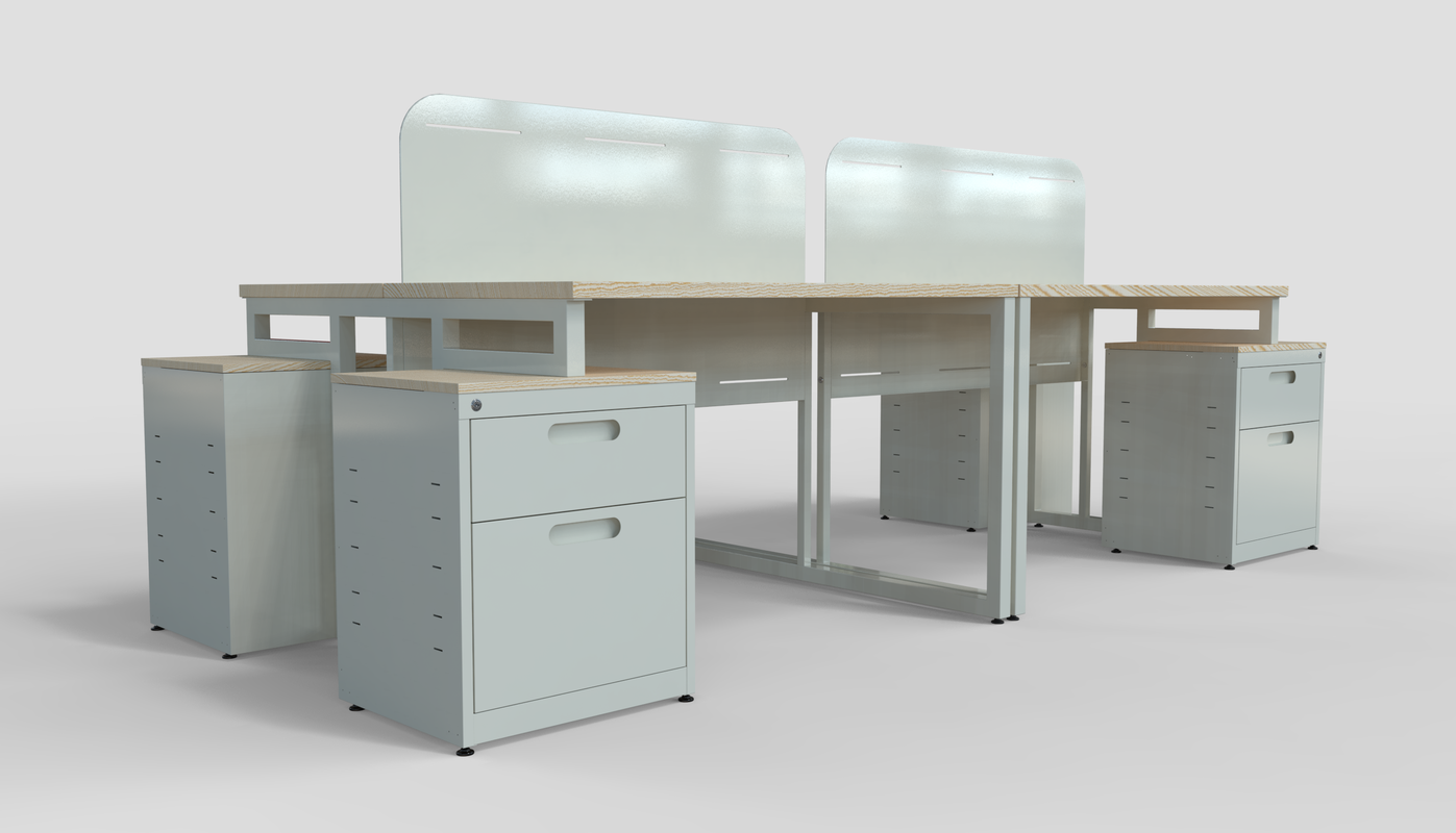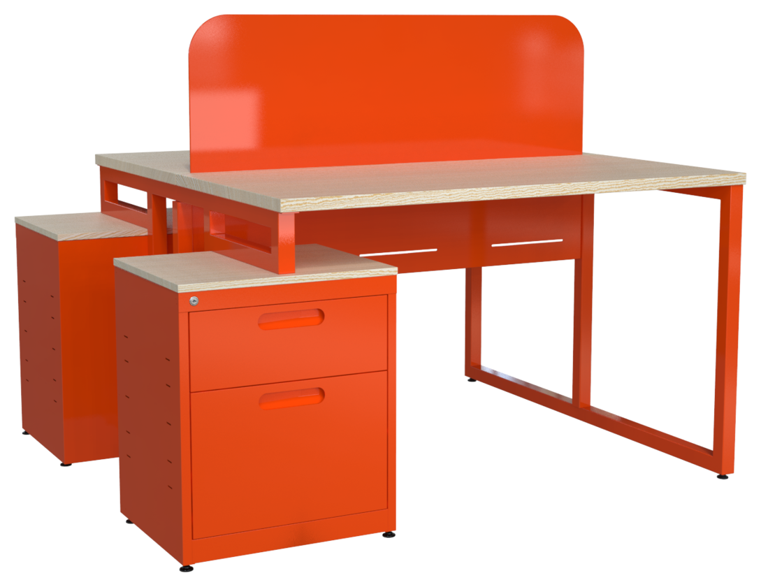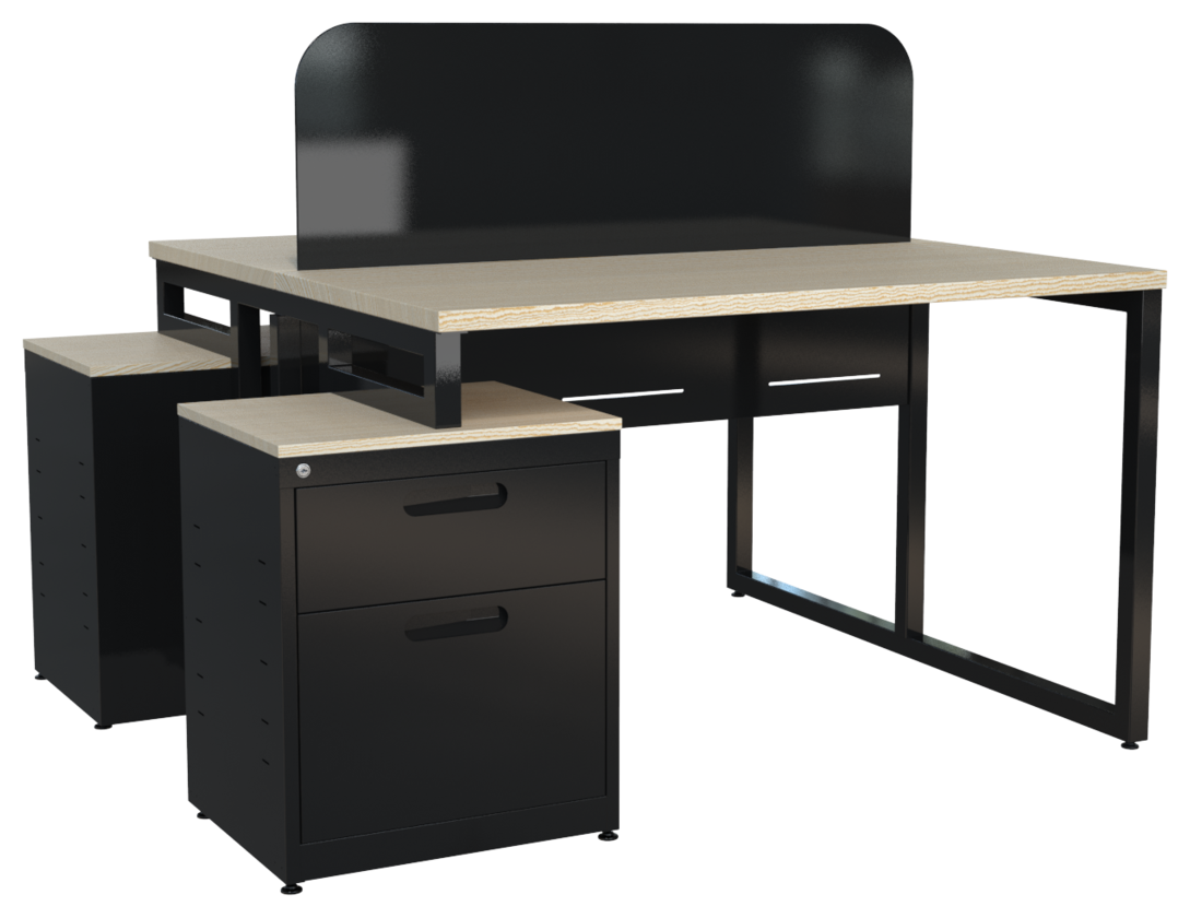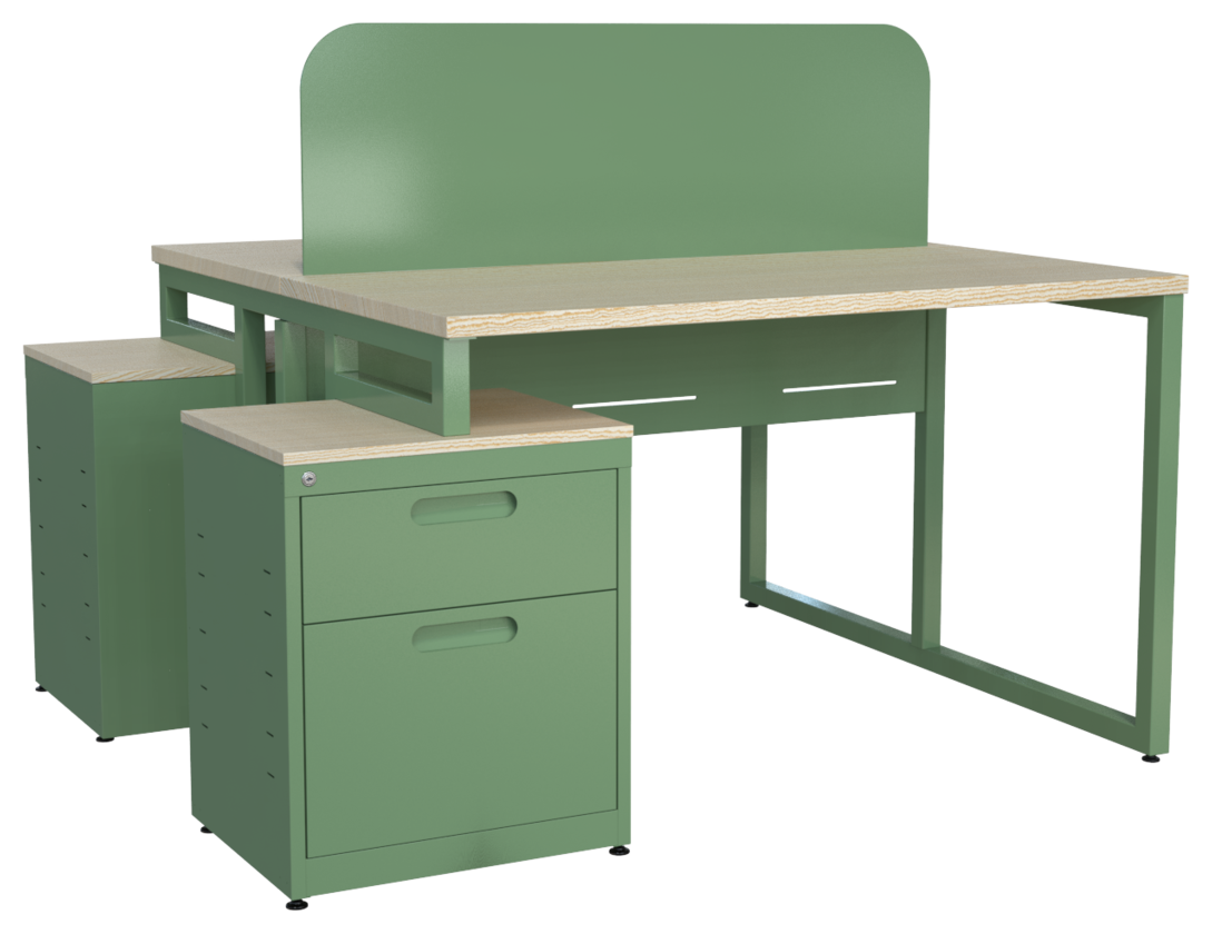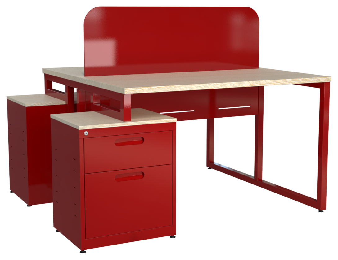 Estación de trabajo CO-WORKING 1212 y 1412, cubierta en melamina, faldón metálico perforado, mampara cal. 20 con/sin corte laser y estructura 1 1/2″ tubular cuadrado. Orientación derecha o izquierda (desarmable). Cajonera metálica: cubierta en melamina 16 mm, cajón papelero y cajón tamaño oficio, nuevo diseño de jaladera embutida y cerradura múltiple.