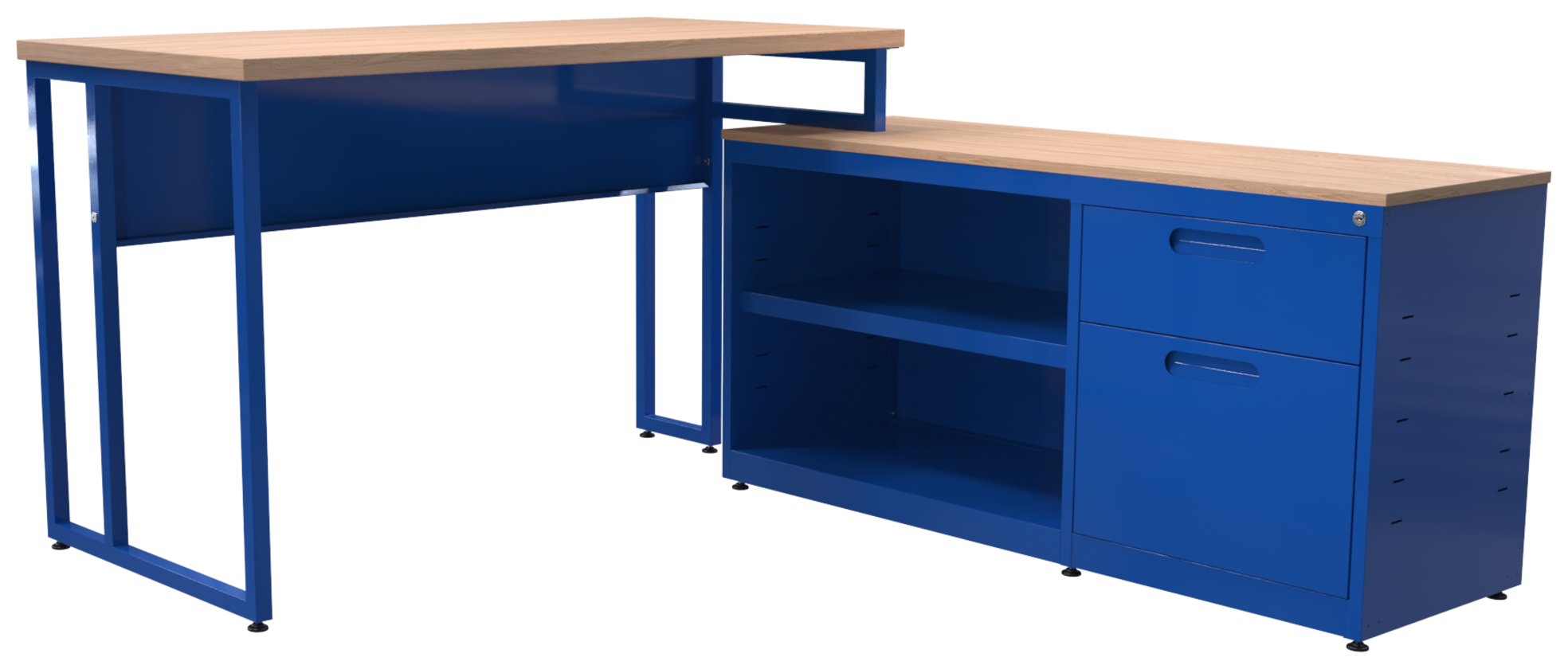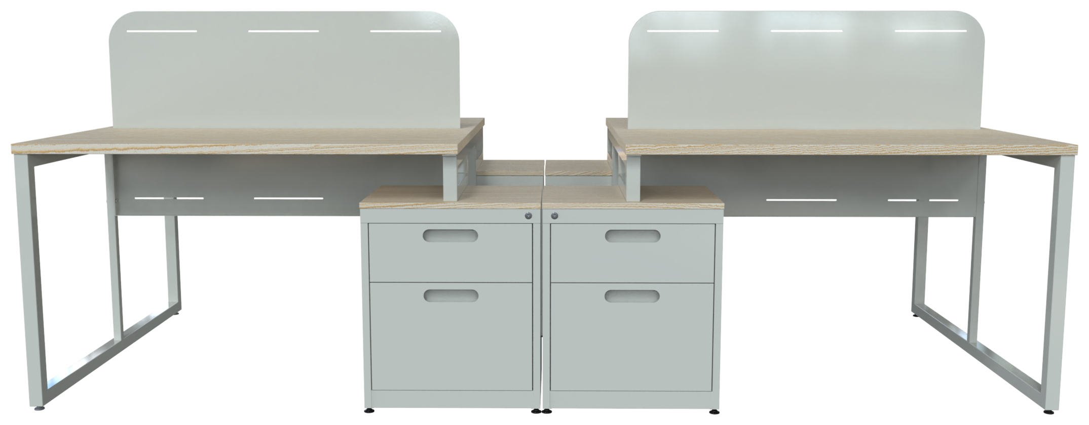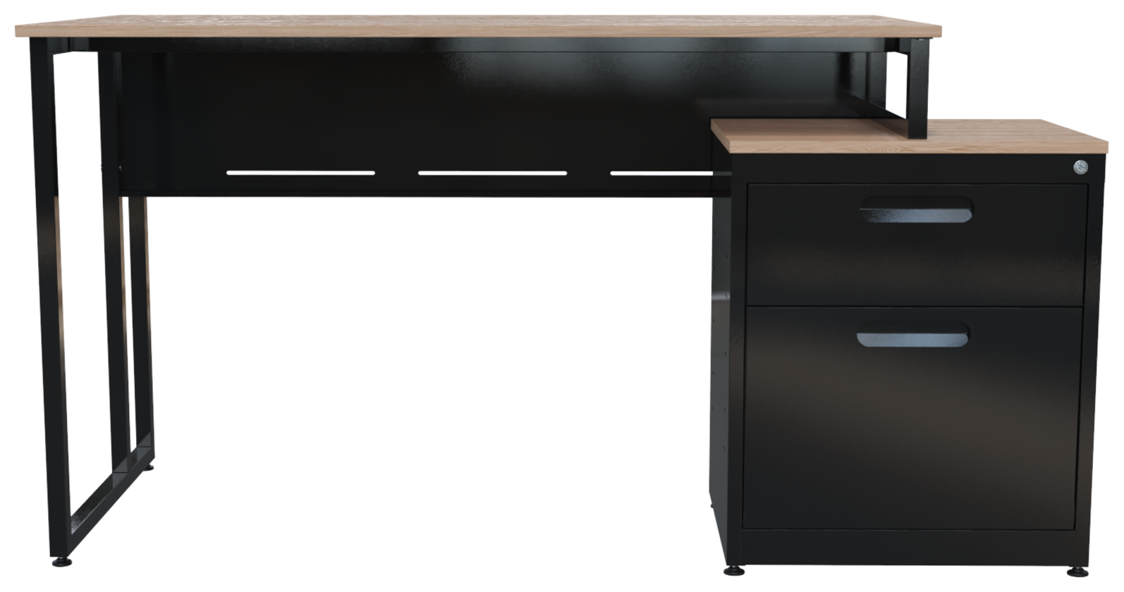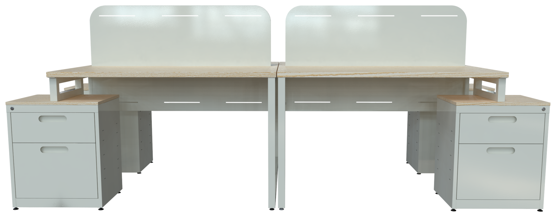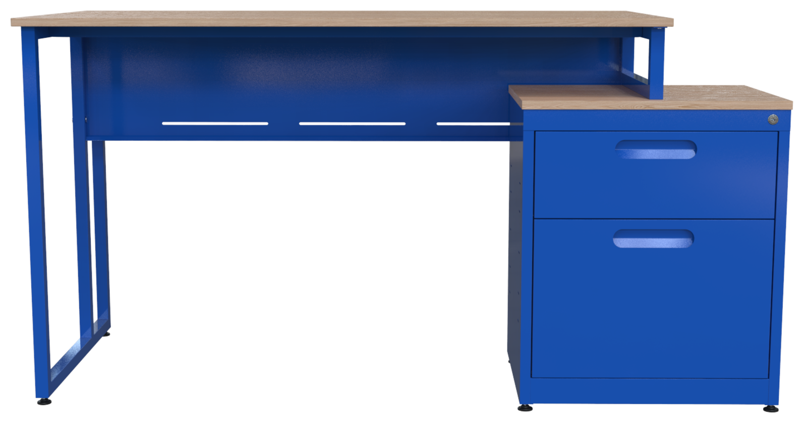 Escritorio metálico ejecutivo, cubierta en melamina 28mm. Con canto PVC, dos cajones papeleros y dos cajones de archivo tamaño oficio, con corredera de extensión móvil, nivelador de altura, jaladera de aluminio y cerradura múltiple. Patas de 1” tubular cuadrado cal. 18. (Desarmable)