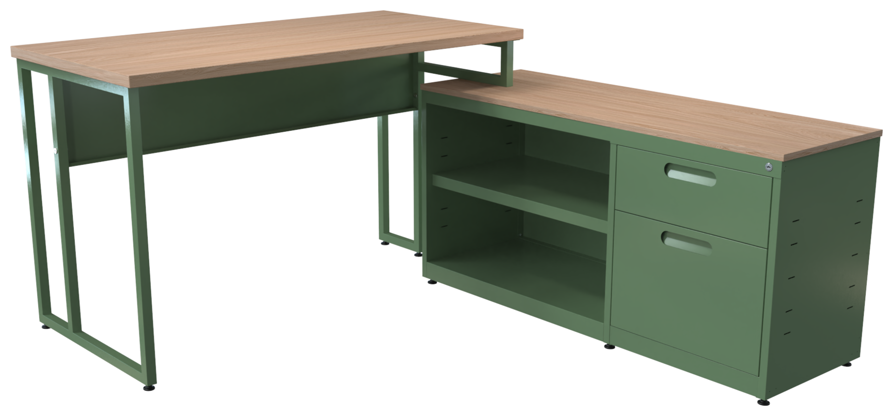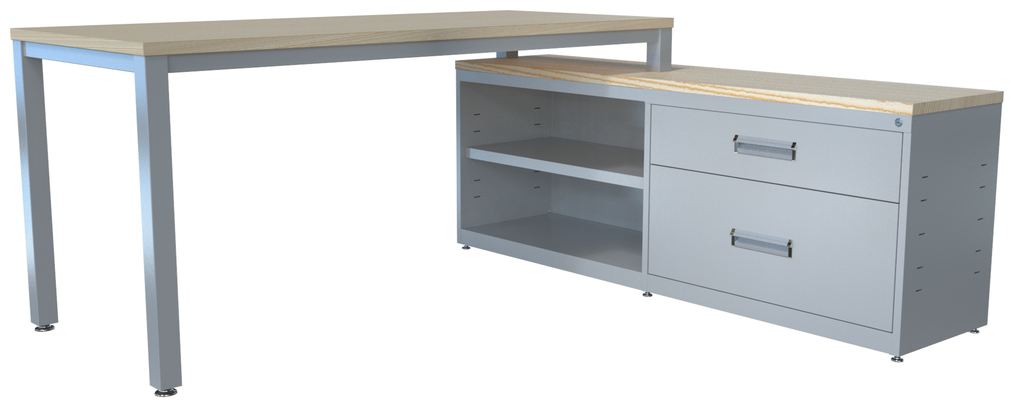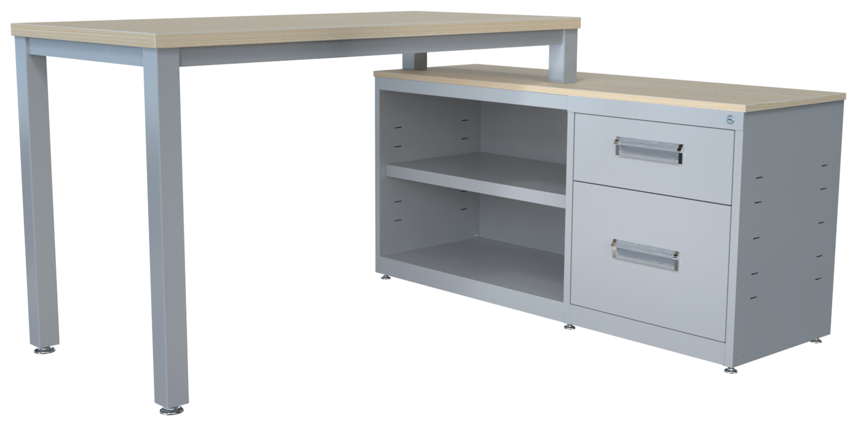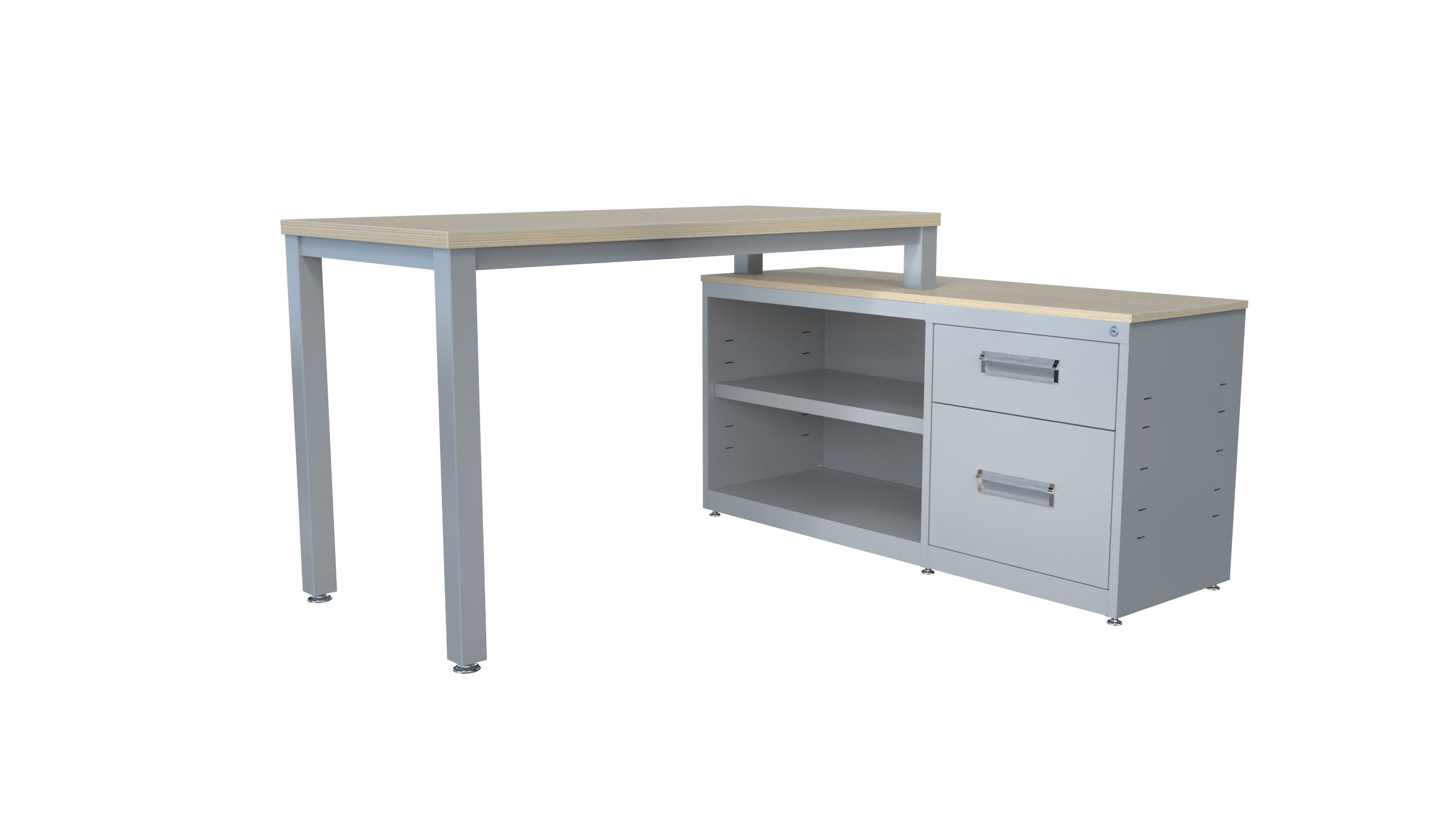 Conjunto metálico C-LVN 160, cubiertas en melamina, faldón perforado, estructura 1 1/2″ tubular cuadrado. Credenza: cubierta 16 mm, cajón papelero y cajón tamaño carta, nuevo diseño de jaladera embutida, cerradura múltiple y entrepaño móvil. Orientación derecha o izquierda (desarmable).