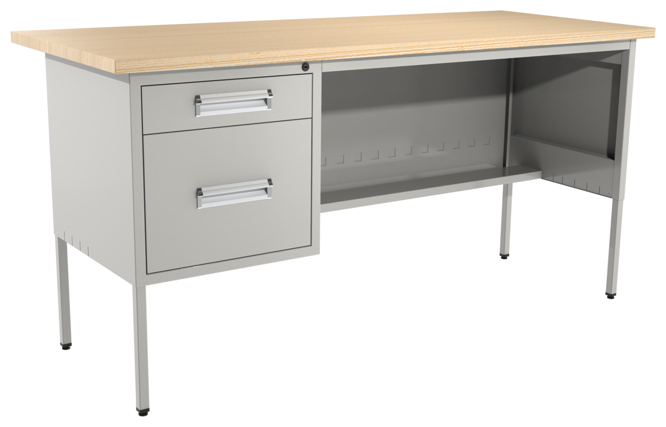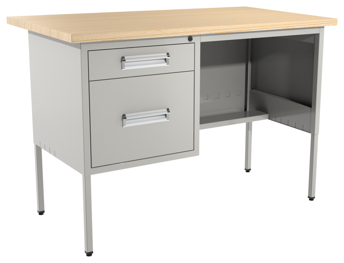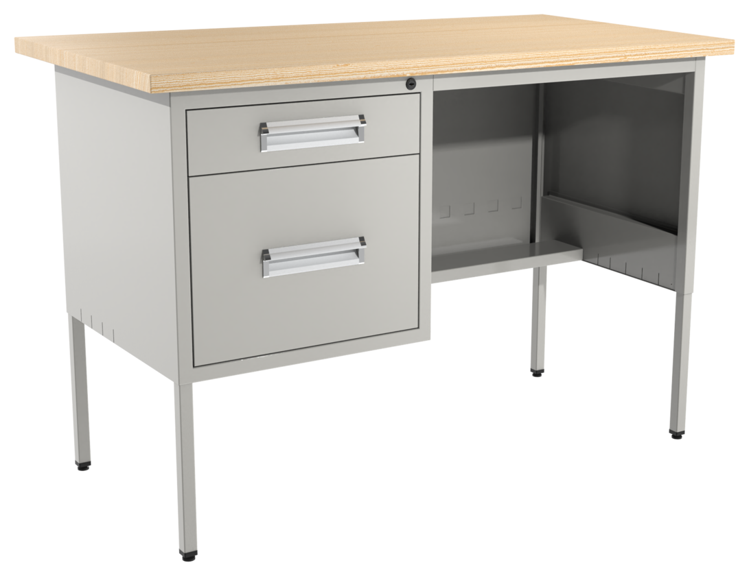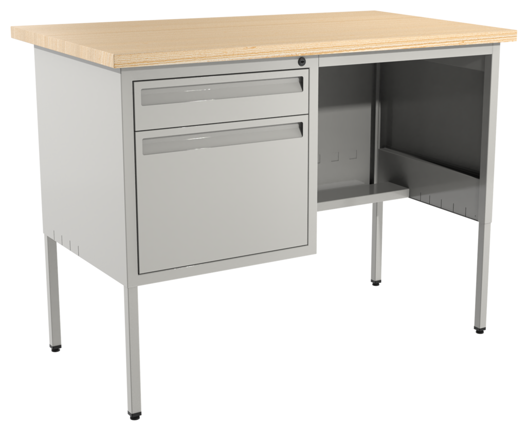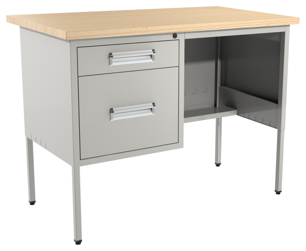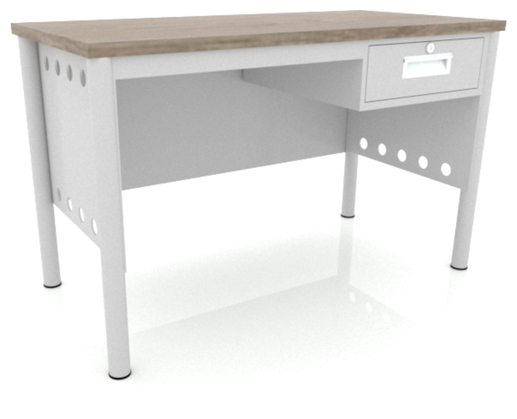 Escritorio metálico secretarial, cubierta de melamina engrosada en 28mm. Con canto PVC, un cajón papelero y un cajón de archivo tamaño oficio. Con correderas de extensión móvil, nivelador de altura, jaladera embutida, cerradura múltiple. Cuerpo metálico y patas de 1” tubular cuadrado. (Desarmable).