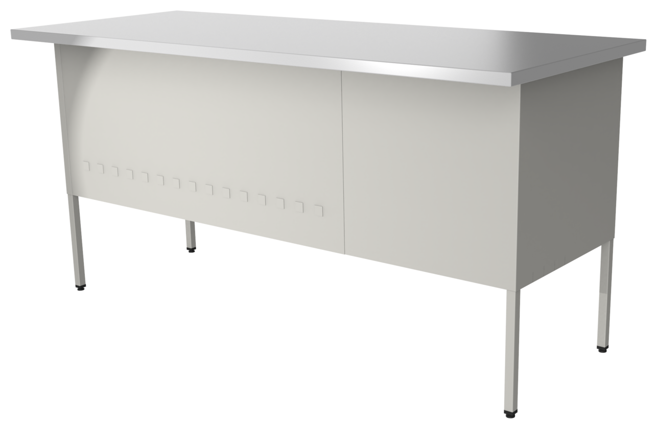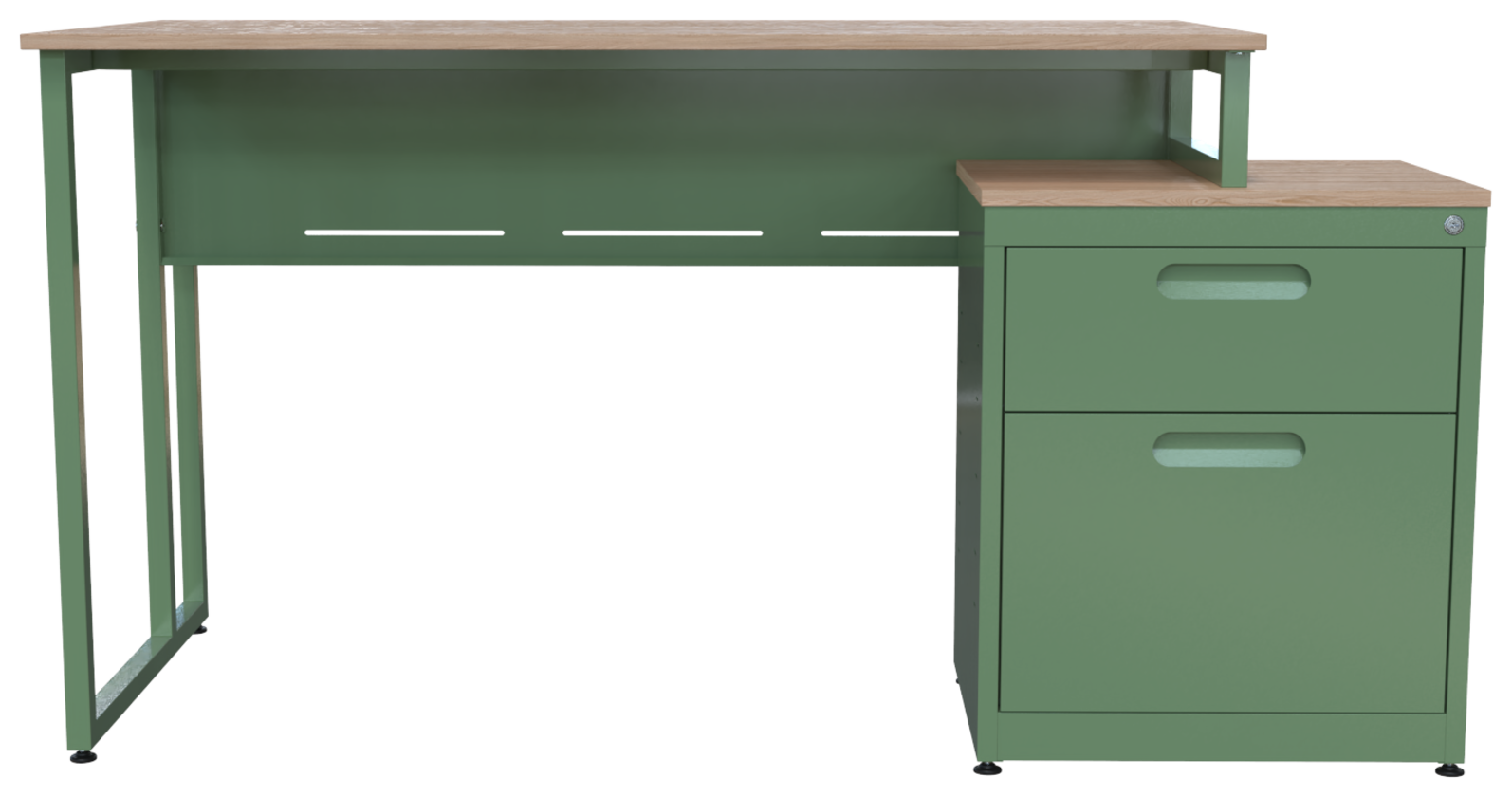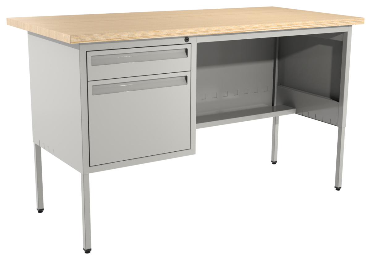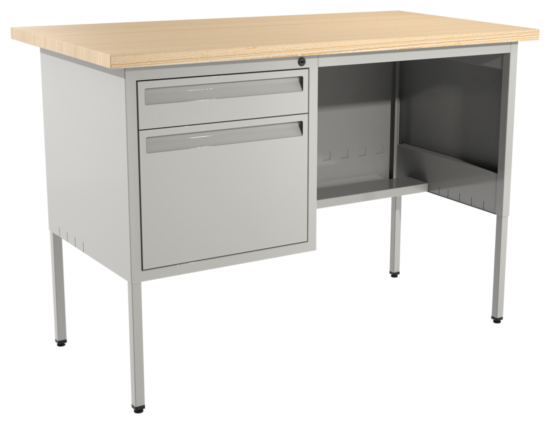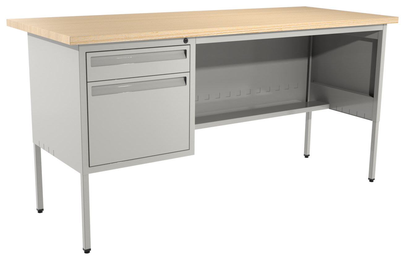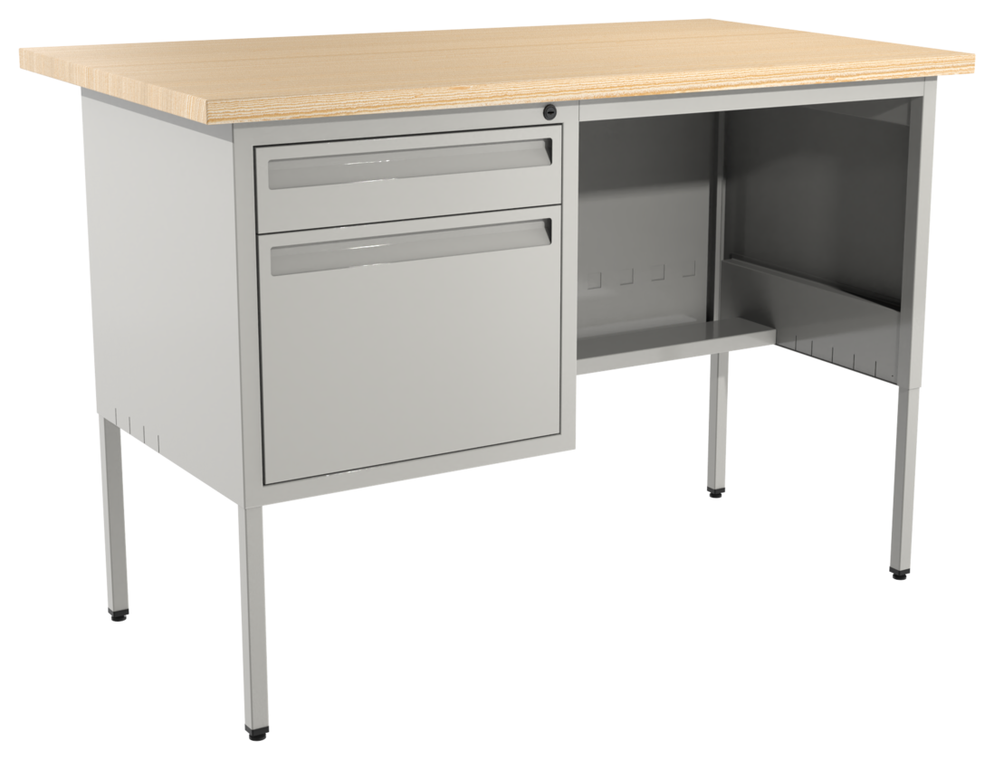 Escritorio metálico secretarial, cubierta de melamina engrosada en 28mm. Con canto PVC, un cajón papelero y un cajón de archivo tamaño oficio. Con correderas de extensión móvil, nivelador de altura, jaladera embutida, cerradura múltiple. Cuerpo metálico y patas de 1” tubular cuadrado. (Desarmable).