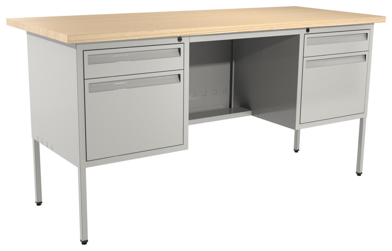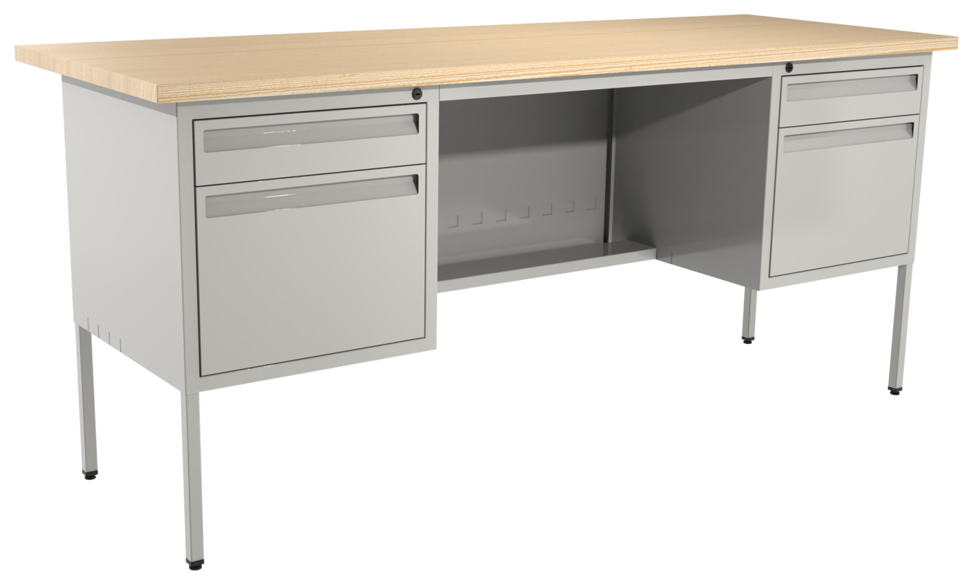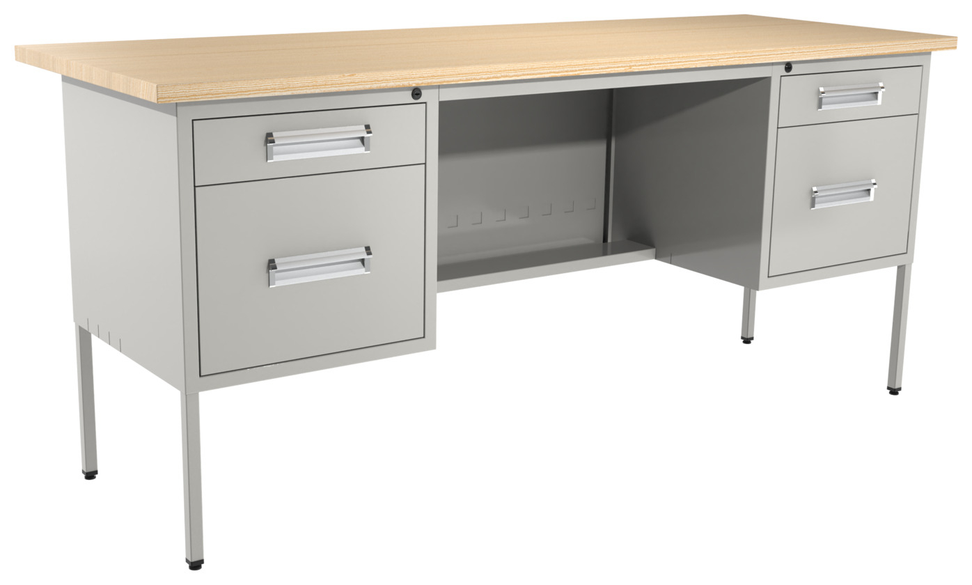 Escritorio metálico ejecutivo, cubierta de melamina engrosada en 28mm. Con canto PVC, dos cajones papeleros y dos cajones de archivo tamaño oficio, con corredera de extensión móvil, nivelador de altura, jaladera embutida y cerradura múltiple. Cuerpo metálico y patas de 1” tubular cuadrado.(Desarmable).