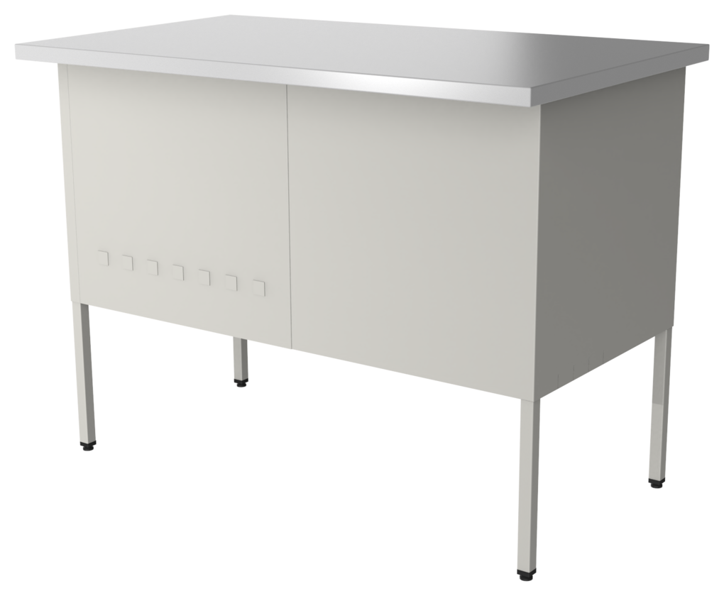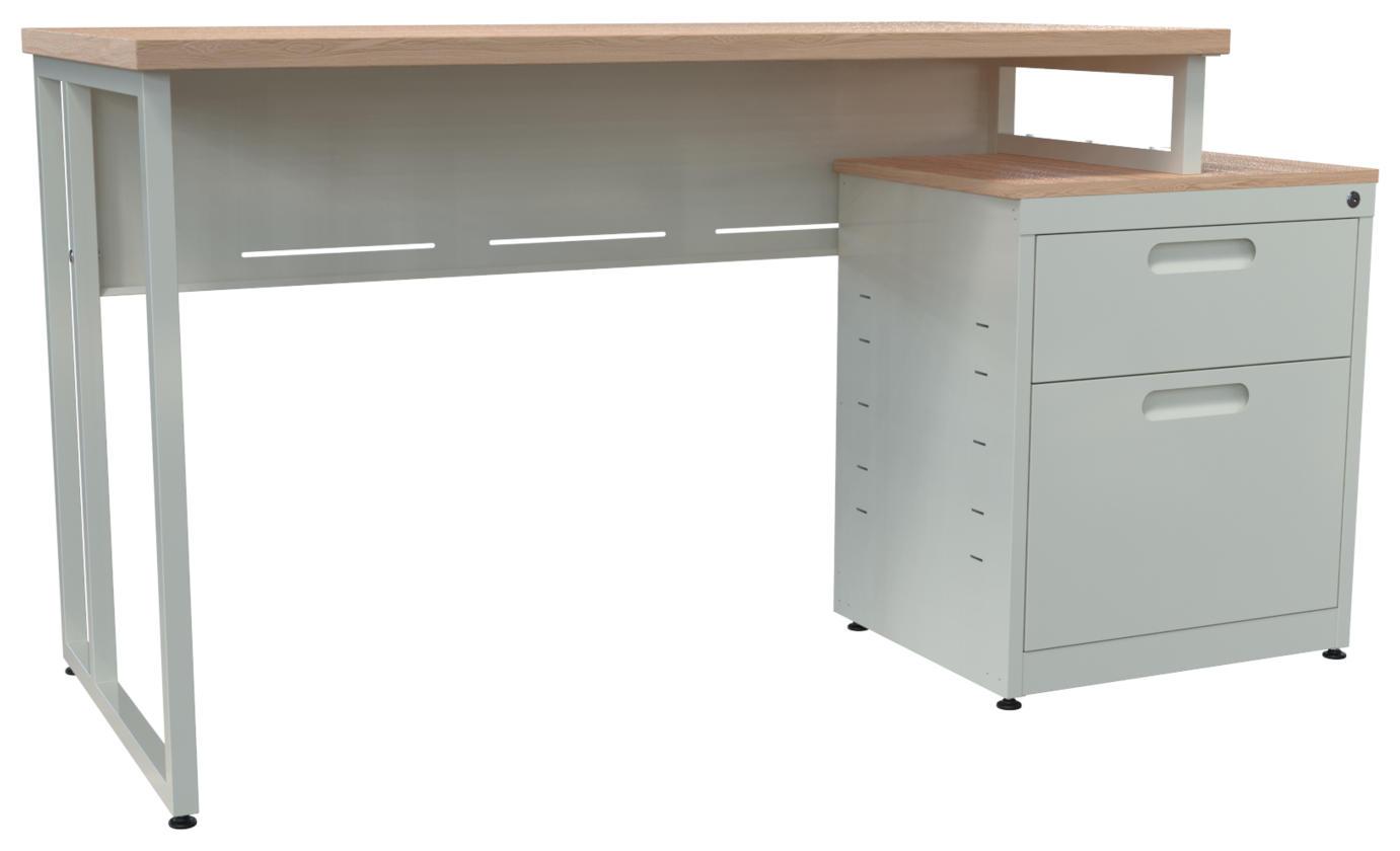 Estación de trabajo E-LVN 120 y 140, cubierta en melamina, faldón metálico perforado y estructura 1×1″ tubular cuadrado. Orientación derecha o izquierda (desarmable). Cajonera metálica: cubierta en melamina 16 mm, cajón papelero y cajón tamaño oficio, nuevo diseño de jaladera embutida y cerradura múltiple.