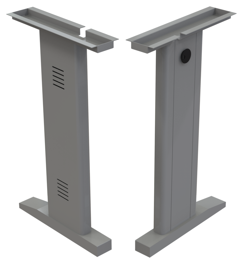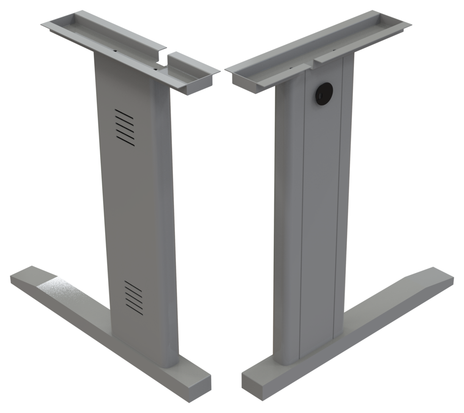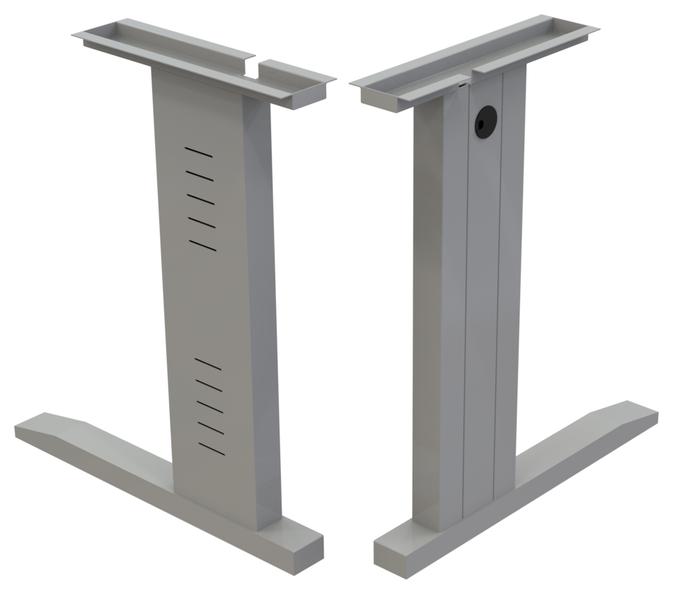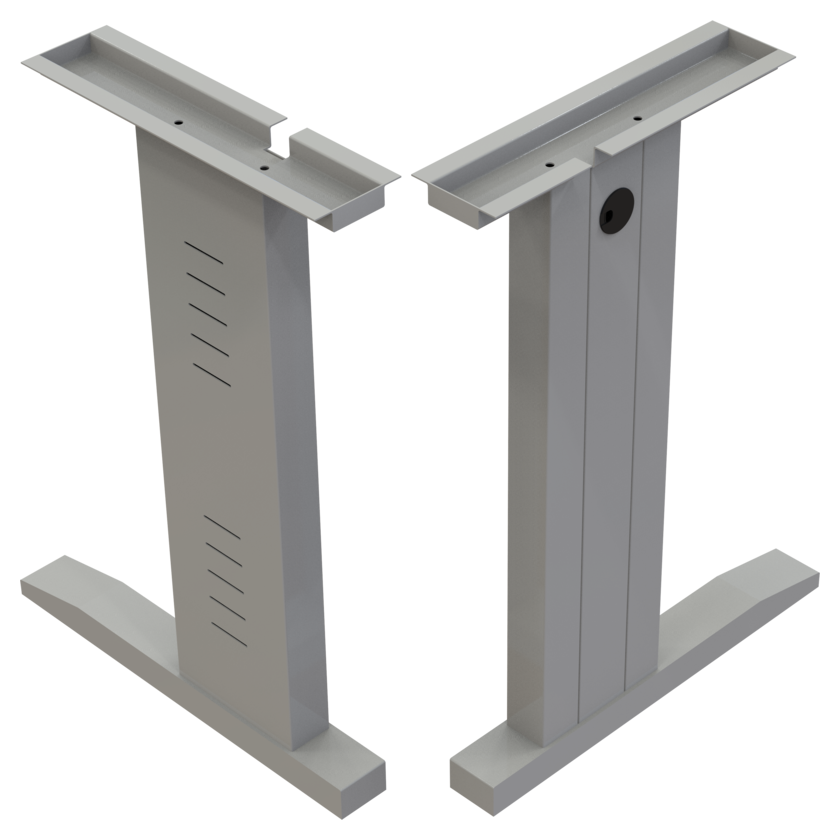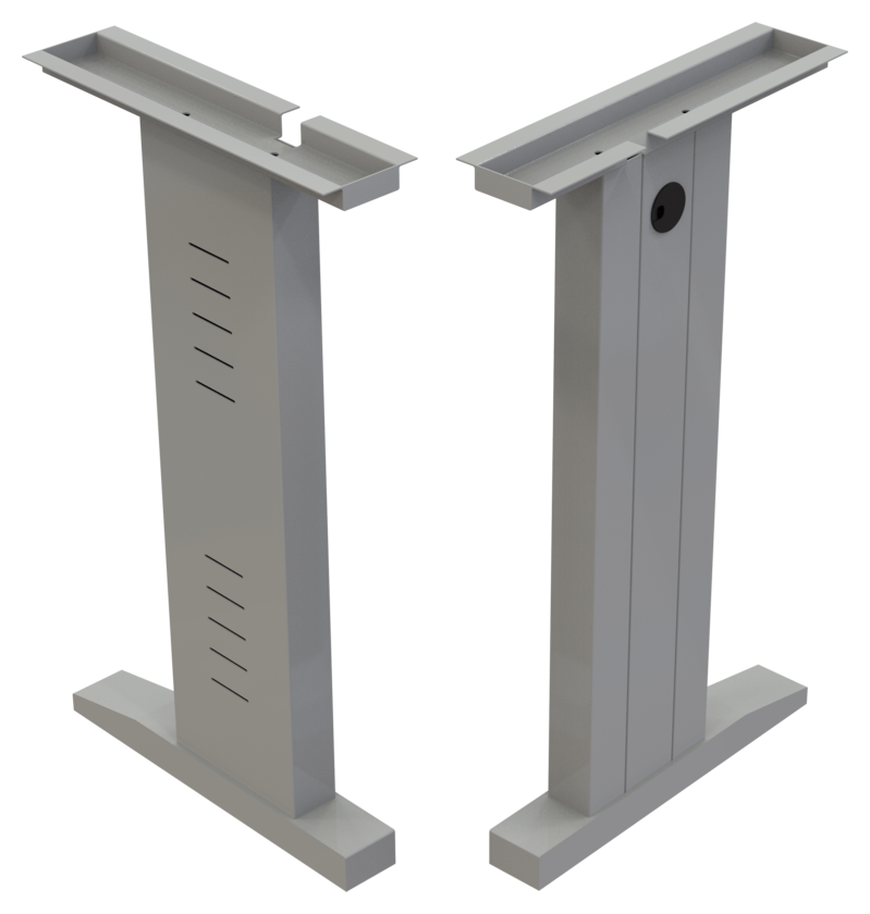Pata metálica en lamina de acero rolado en frio calibre 20 y calibre 18. Desarmables. Diseño en corte laser parte externa. Nivelador de altura de 2″. Remaches y perforación para pasacables e instalación de faldón.